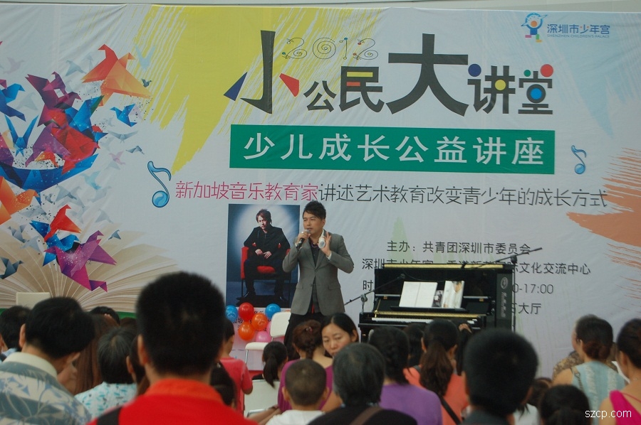 由团市委主办、市少年宫中心承办的2012“小公民,大讲堂”少儿成长公益讲座活动,自今年4月份以来已连续推出了多场公益讲座,取得良好反响。616日下午,应市少年宫与香港新苗国际文化交流中心的邀请,新加坡的著名音乐家伍俊华教授在少年宫水晶石大厅为现场近200名深圳艺术教育工作者和青少年带来了一场有关“艺术教育与青少年成长”专题公益讲座。在讲座活动中,教授以轻松幽默的语言介绍了他的成长经历以及对中国的热爱、艺术教育对青少年成长过程中所起到的积极作用、目前国际艺术教育大环境等做了深度的解析。教授在现场深情演绎了  Life》《Hope》《Passion》等曲目,并与青少年互动分享新加坡博物馆收藏的鱼尾狮乐器——“Merlion”,博得现场听众的阵阵掌声。